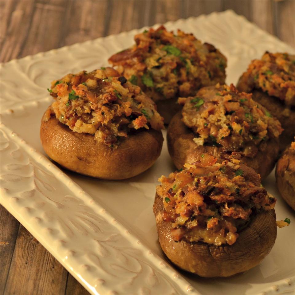I made these for my New Year s Eve party and they were a big hit. They are rich and tasty and very easy to make. I made a few small changes 1) I had precooked bacon on hand so I used that. In place of the bacon fat I cooked the onions and mushroom stems in olive oil and butter. 2) I used panko instead of regular breadcrumbs. 3) I don t have a blender so I just chopped things very fine and mixed everything together. Finally I made the filling the day before then stuffed the mushrooms early the day of the party and refrigerated until I baked them later in the evening. This seemed to work out just fine and made prep for the party much easier.