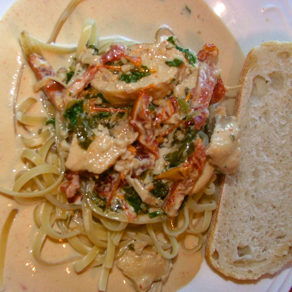 This is a very rich and creamy pasta recipe that was almost sinful! I tried to simplify the recipe as a few other reviewers have done and only use one sautee pan. First, I pounded out my chicken breasts to make them all even thickness then I dipped them in seasoned flour (smoked paprika, salt and pepper)and cooked them in a mixture of olive oil and butter until cooked through (about five minutes a side). I removed the chicken and added the garlic and about 1 1/2 cups chicken broth to deglaze the pan. I then added my chopped up sundried tomatoes and let them cook until tender. Then I added 2 cups of cream and about 1 cup of freshly grated parm cheese. I let this cook for about 8 mins and then added my chicken which I had sliced into three pieces each and let the chicken heat back up in the sauce and added the basil. This was soooo good - like a meal at a restaurant!