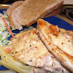 This will be added to my list of restaurant quality dishes. The sauce is creamy and velvety delicious and the whole dish makes for a beautiful presentation on the plate. I used two chicken breasts (for the two of us) but kept the amounts of the rest of the ingredients the same. I added white wine to the sauce which must be reduced a good long time to get the thick rich consistency I was after. After sauteeing the chicken breasts I sauteed shallots and fresh mushrooms then added them to the sauce. I served this with whole wheat fettucine and roasted asparagus. We really enjoyed this however when I make this again I will stick with doubling the sauce but keep the amount of tomatoes the same as the amount of tomatoes meant for four breasts was a bit much for two.