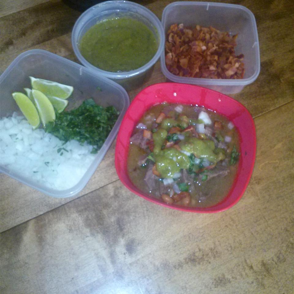 I felt this was a very good recipe, however next time I make it I will use stewing meat.. Flank steak is for quick searing not a long simmer. Definitely not tender enough after about an hour. Also, there is no need to warm the beans ahead of time just throw them in the pot about five minutes before the soup is done. Make sure you rinse and drain the beans first or you will get a pastey taste. You don't need chicken granuels if you don't have them. Use 3 boullion cubes. Same thing. I actually used chicken "stock" (not broth) for more flavor and additional liquid. I served this with all the toppings mentioned but added Mexican shredded cheese, sour cream and crushed lime flavored Xochitl tortilla chips. These chips are very thin and crispy. Excellent!!