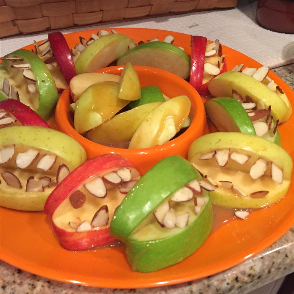 Easy crowd-pleaser for halloween parties. I dipped the slivered almonds in caramel apple dip before inserting them in the apples - it made the almonds stick better and made the "teeth" look even more like a monster mouth with "gross" brown stuff around them. Almost didn't make it out of my kitchen to the party because my kids couldn't stop snacking.